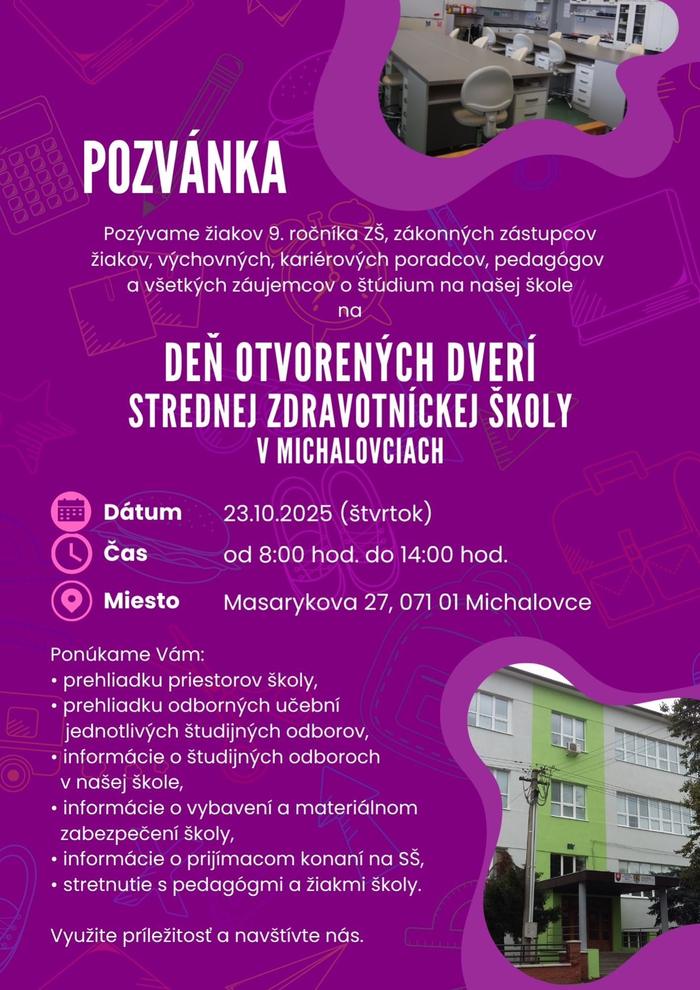 - Napísala Mgr. Alena Michalovová, 10.10.2025, jazyková korekcia PhDr. Bibiána LojanováPozývame žiakov 9. ročníka ZŠ, zákonných zástupcov žiakov, výchovných, kariérových poradcov, pedagógov a všetkých záujemcov o štúdium na našej škole na Deň otvorených dverí Strednej zdravotníckej školy v Michalovciach, ktorý sa uskutoční 23.10.2025 (štvrtok) od 8:00 hod.